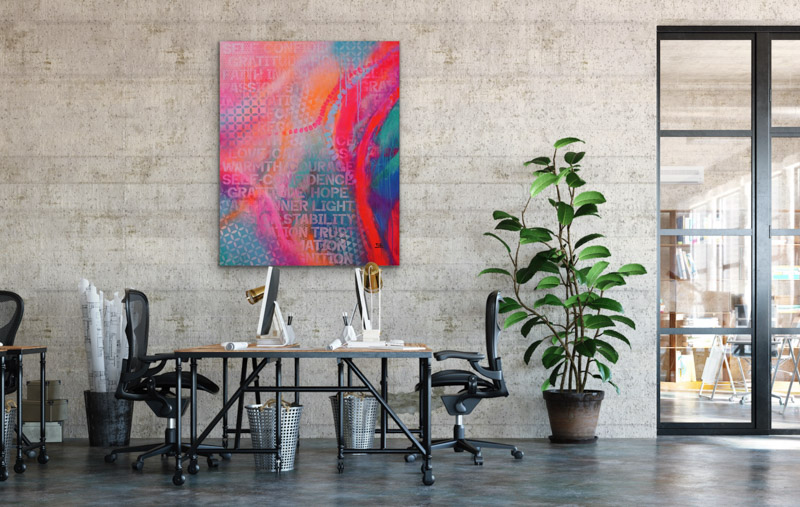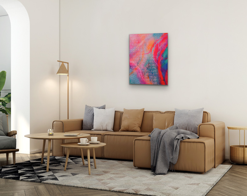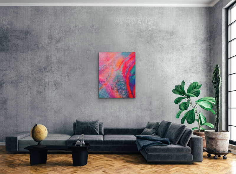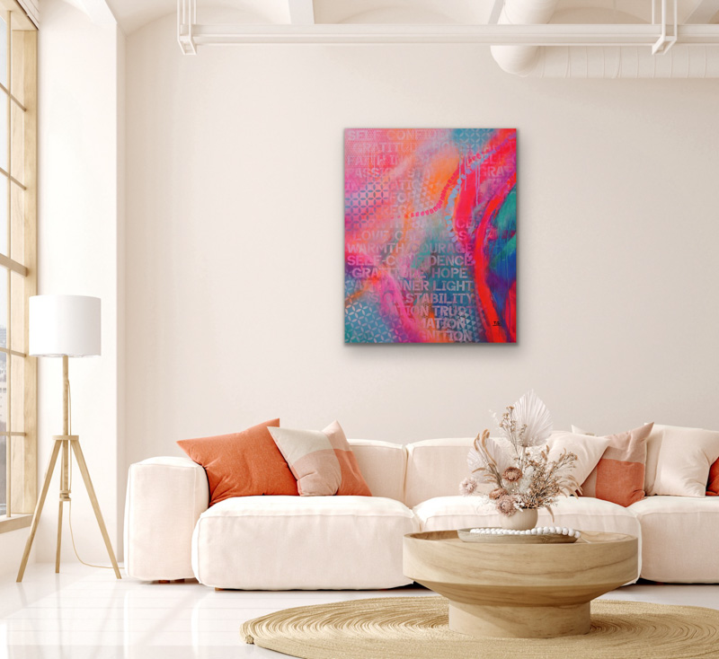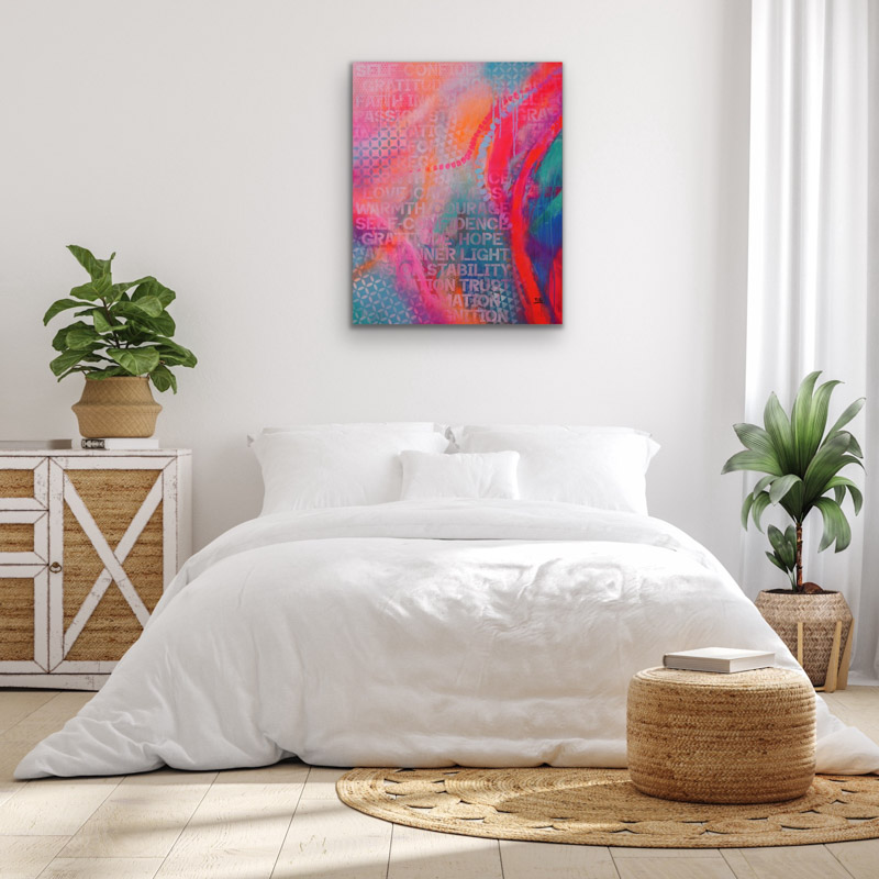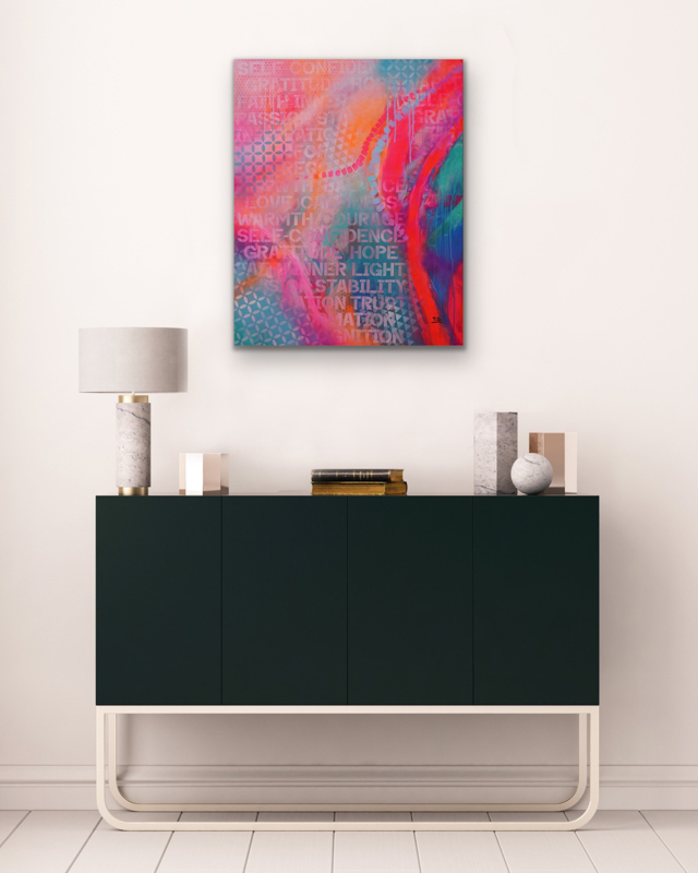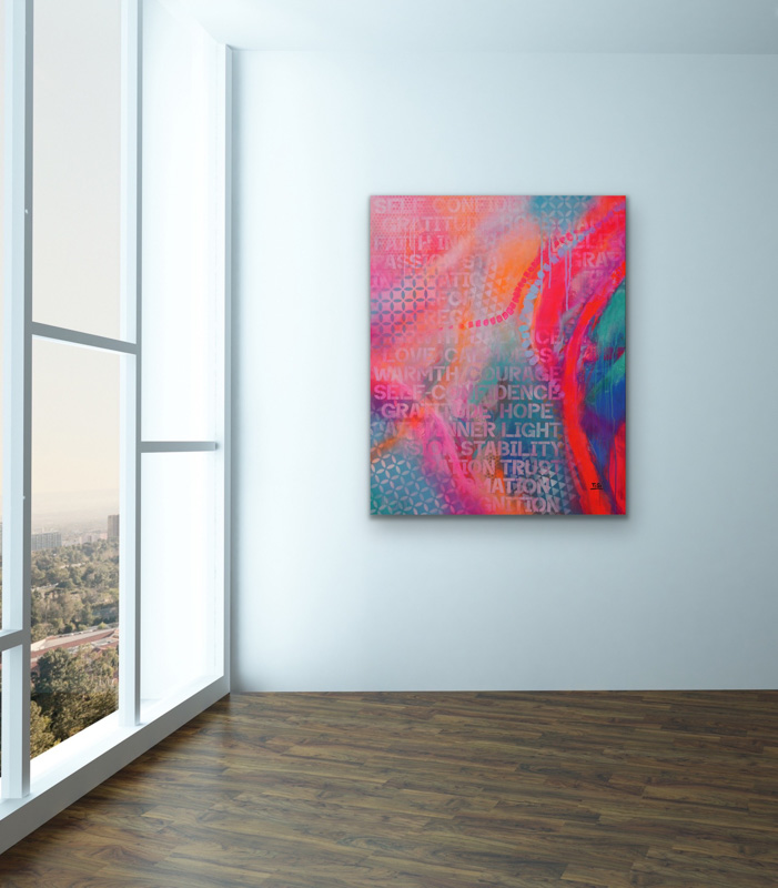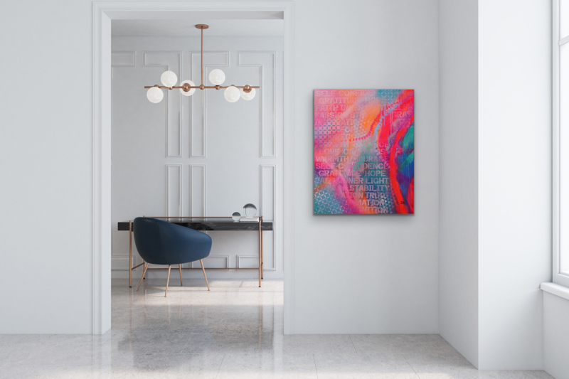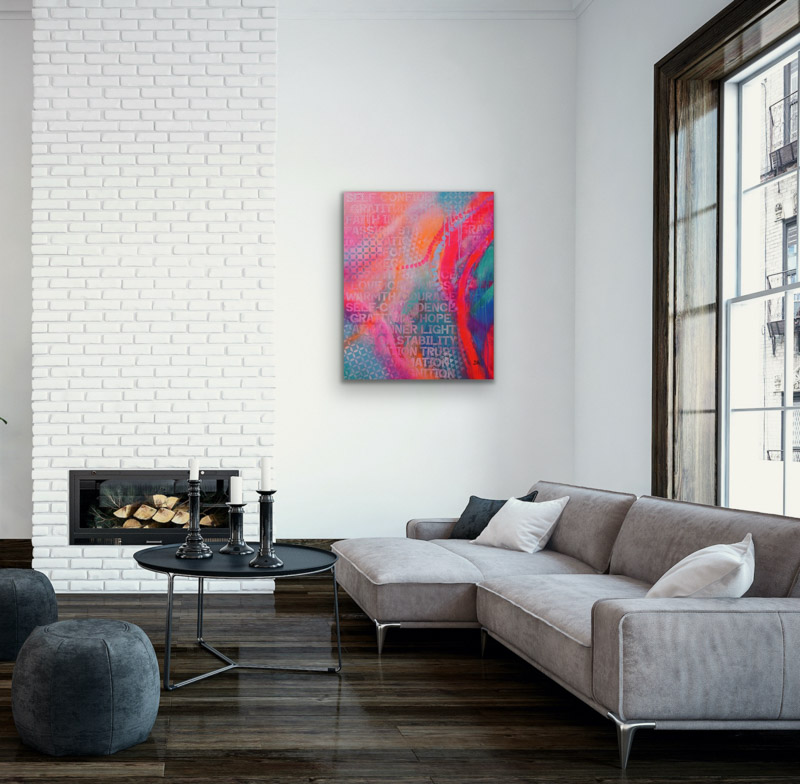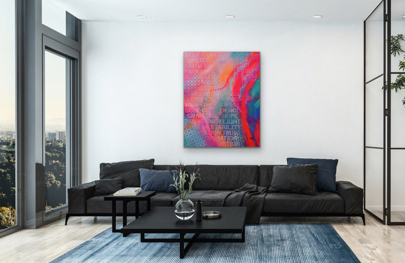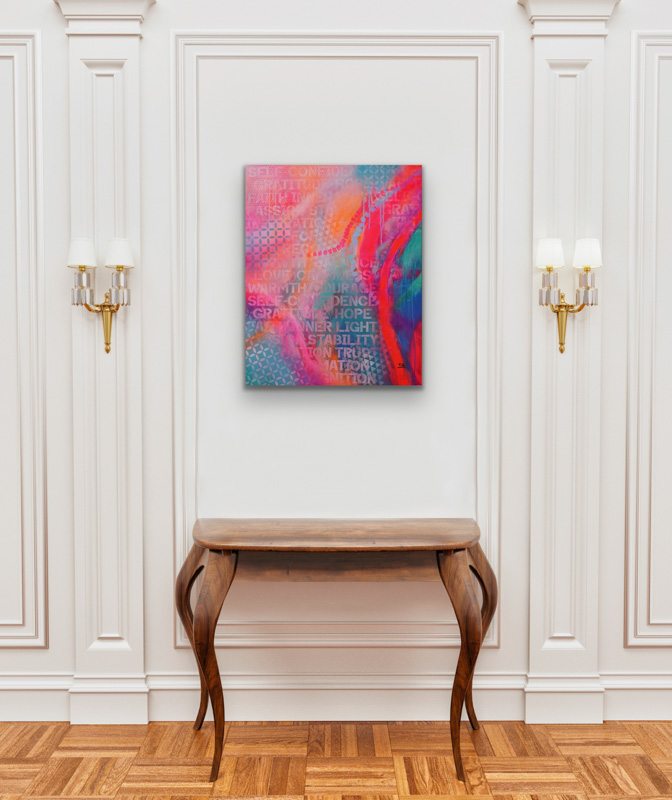 Dieses Werk erzählt von innerer Stärke, die leise wächst – in Worten wie Love, Courage, Gratitude, Hope. Zwischen Neon und Pastell entfaltet sich eine vibrierende Balance aus Energie und Ausdruck. Die Komposition steht für Aufbruch, Zuversicht und Selbstvertrauen – für den Mut, das eigene Licht sichtbar zu machen.