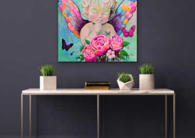 „THE SECRET: INNER ECHOES“ verbindet zarte Farbverläufe mit intensiven Akzenten. Die Komposition wirkt ruhig und gleichzeitig lebendig – ein Kunstwerk, das Räume mit Leichtigkeit, Optimismus und innerer Wärme erfüllt.